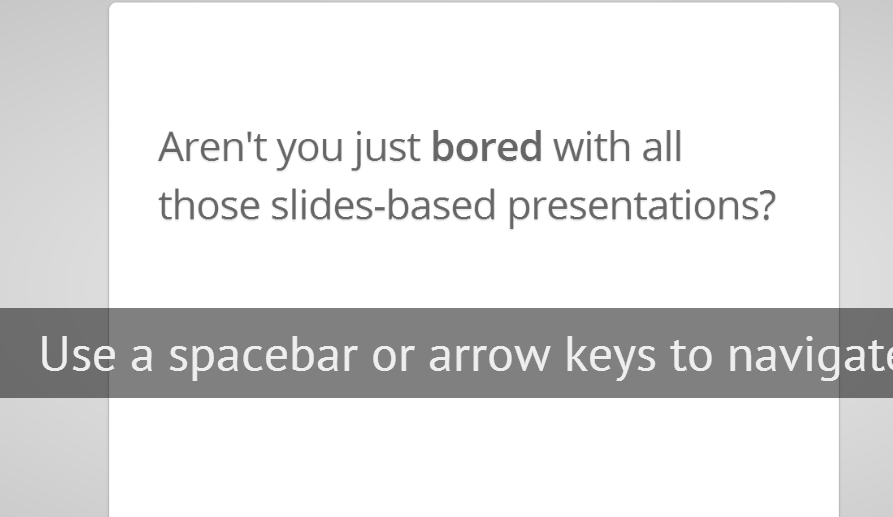 impress.js | presentation tool based on the power of CSS3 transforms and transitions in modern browsers | by Bartek Szopka @bartaz: impress.js is a presentation tool based on the power of CSS3 transforms and transitions in modern browsers and inspired by the idea behind prezi.com.